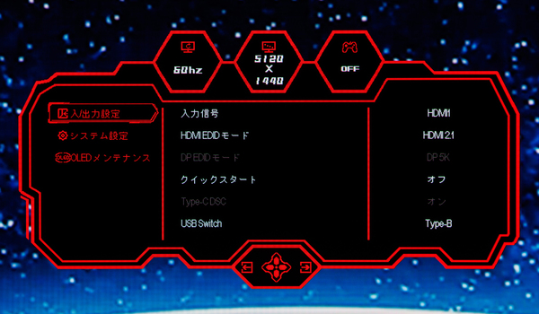 映像入力端子はDisplayPort 1.4が1基に、HDMI 2.1が2基、それにUSB 3.1 Type-Cを1基装備。どの端子でも、解像度5120×1440ドットでリフレッシュレート144Hzが利用可能だ。さらに、これらの端子を同時利用し、1枚のパネルに2つの画面を表示するPBP(ピクチャーバイピクチャー)およびPIP(ピクチャーインピクチャー)にも対応している。