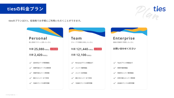 料金プランは、個人事業向けから企業向けまで用意されており、ニーズに応じた選択が可能だ。個人向けのPersonalプランは年額25,080円、グループ向けのTeamプランは年額121,440円で提供されている(料金はいずれも税込)。また、複数の事業所で管理したい企業向けのEnterpriseプランも用意されているとのこと。