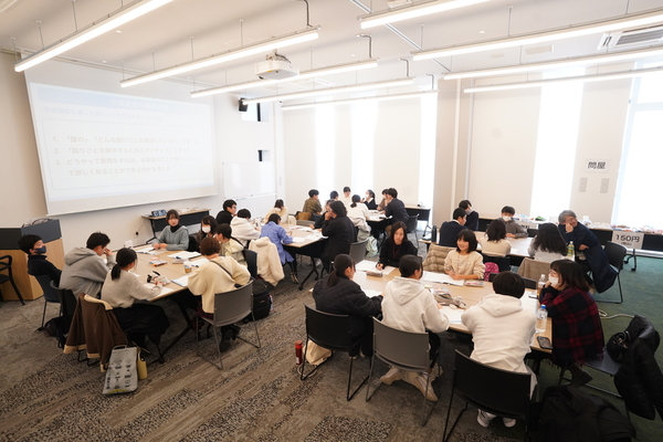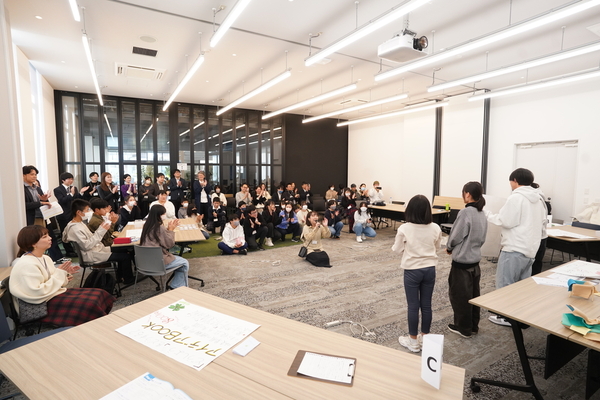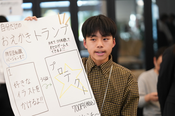 「仕入れ」は疑似通貨をもとに材料を仕入れ、「製造」はサンプルとなる製品を制作。並行してPRするためのポスターも作っていった。「広告」は参加者の前で自分たちが考えた製品を発表。演劇仕立てで発表するグループもあり、学生たちの柔軟な発想に驚かされた。「販売」は参加者に購入してもらう工程で、実際の売上はどれくらいだったのか「計算」で確認。最後に「振り返り」でイベントは終了した。