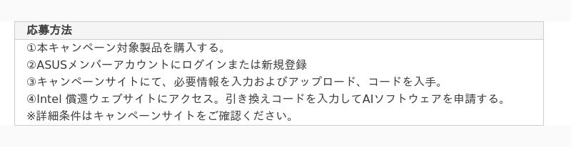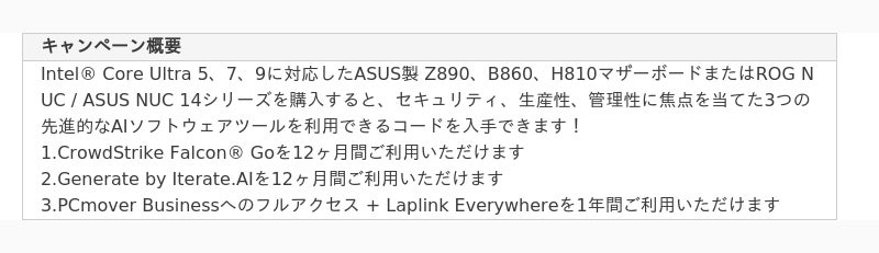 ASUS JAPAN株式会社はIntel(R) Core Ultra 5、7、9に対応したASUS Z890、B860、H810マザーボードまたはROG NUC / ASUS NUC 14シリーズを購入すると、セキュリティ、生産性、管理性に焦点を当てた3つの先進的なAIソフトウェアツールを利用できるコードを入手できるキャンペーンを2025年3月28日まで開催。