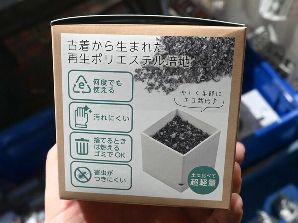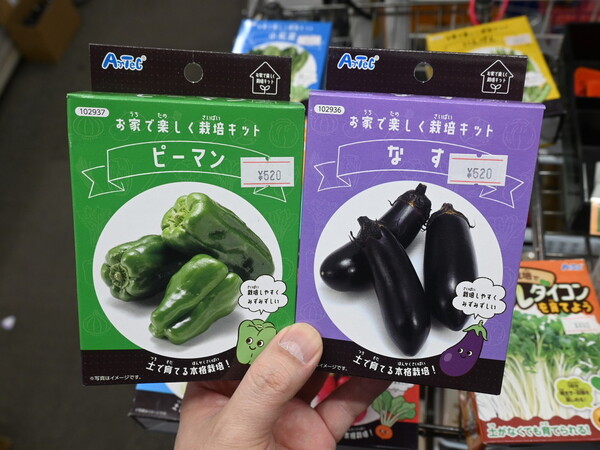 手のひらサイズの栽培容器で野菜や果物を育てることができる、コンパクトな栽培キット。店頭の「野菜栽培コーナー」で販売されており、ショップによれば意外なほどの人気があるという。