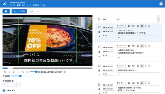 - - 発話に合わせた正確なタイムコードを自動で付与し、各ページの表示時間(デュレーション)設定も各社ごとに設定可能。