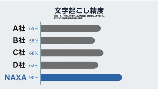 - - 日本語番組のARIB字幕制作に特化した独自の音声認識エンジンを開発し、文字起こし精度90%以上を実現。(※様々なジャンルのテレビ番組80本、10万字で検証した際のWER(Word Error Rate)が10%以下に収束。)