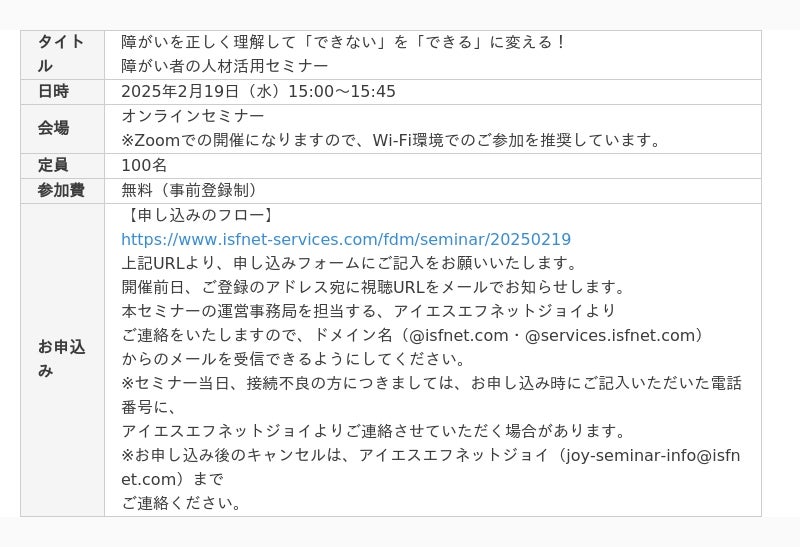 株式会社アイエスエフネットジョイ(本社:東京都中野区、代表取締役:渡邉幸義、以下アイエスエフネットジョイ)は、2025年2月19日(水)の日程にて「障がいを正しく理解して「できない」を「できる」に変える!障がい者の人材活用セミナー」を開催いたします。