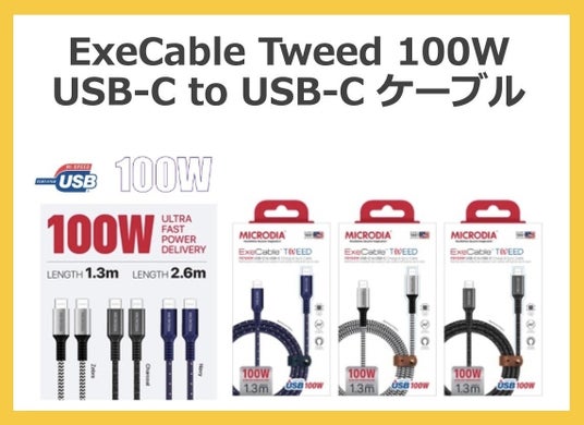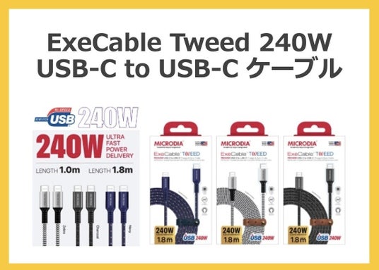「MegaCharge 300W」の性能を最大限に発揮するには、適切なケーブルが欠かせません。MICRODIAのExeCable Tweed USB-C to USB-C(100W対応・240W対応)は、高速充電・データ転送が可能な耐久性抜群のケーブルです。