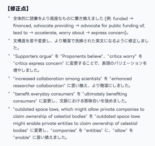 ・ 改修内容: 添削例を提示し、どの単語・文構造を修正したかを【修正点】として細かく解説。 これにより「この部分は因果関係を明示する接続詞を使うべき」「ここは名詞形に変えるとコンパクトに要点がまとまる」など、具体的な改善アドバイスが得られるようになりました。
