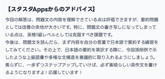 ・ 背景: 意見論述やEメール問題向けのAIアドバイスでは、ポジティブで親しみやすい口調を重視していましたが、要約問題に取り組む受験生の多くは上位級(1級・準1級・2級)を目指す層で、より高度なアドバイスを求める傾向があります。