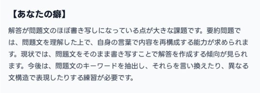 ・ 改修内容: 受験生の答案をAIが解析し「主語や重要語句が抜け落ちやすい」「同じ文型ばかり使っている」などの書き癖を一覧表示。「どの点を最優先で直すべきか」を受験生が明確に把握できるようになりました。