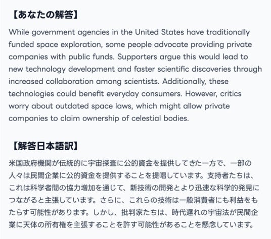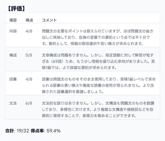 要約問題は慣れが大切とはいえ、闇雲に数をこなすだけでは伸び悩むケースが多いです。今回のAI添削では、書き癖・語彙・文法・接続詞の使い方などを網羅的に指摘するため、効率良く学習が進められ、短期間で合格レベルに到達しやすくなります。