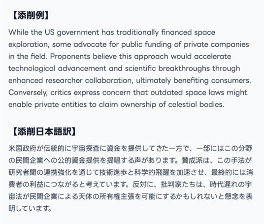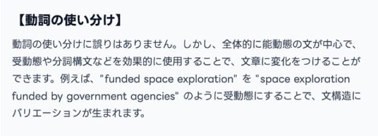 ・ 改修内容: 今回の要約用添削にも、自動詞・他動詞の使い分け指摘を反映。何気なく使った動詞が目的語を伴えない(あるいは必要)動詞だった場合、AIが具体例とともに修正提案を行い、文法精度を高めます。