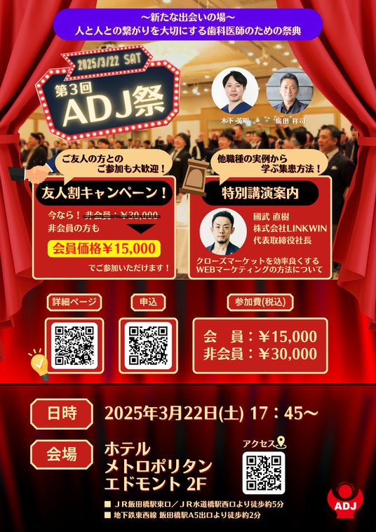 株式会社オール・デンタル・ジャパン(本社:東京都新宿区原町3-21-1-1101、代表取締役:木下英明、廣田祥司 )主催のイベント「第3回 ADJ祭」を2025年3月22日(土)ホテルメトロポリタンエドモント2階にて開催いたします。
