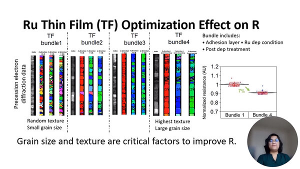 そのRuの最適化の効果を検討したのが下の画像である、Thin Filmとあるように、これはまだパターニング(配線構成)の前段階、まだエッチングを行なわず全面Ruの膜が覆っている段階での比較である。ここでは接着層やRuの蒸着条件、および蒸着後の主要な処理などについて4種類の最適化技法を行ない、その結果を比較したものである。