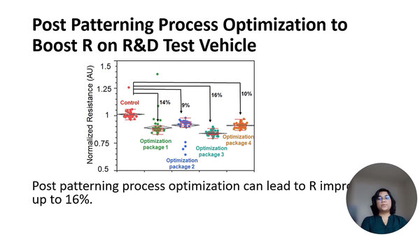 Bundle 1とBundle 4で比較すると、Bundle 4の方が配線抵抗が7%ほど減少したとしている。では大きめの結晶になるといいのか? というとそういうわけでもないようで、実際にはOptimization Package 3が一番性能が良く、16%の抵抗削減が実現できたそうだ。