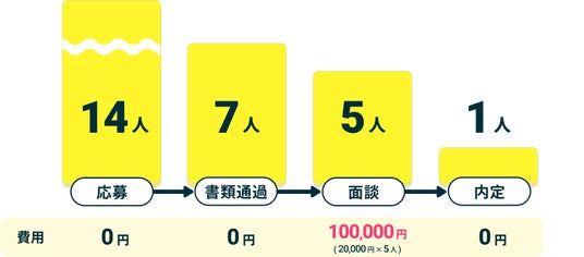 PITの審査合格率はわずか10%のため、書類選考率は50%と2人に1人が有効応募者です。14人から応募があった場合、7人が書類通過、5人が面談実施、1人内定となった場合、1人を採用するのにかかった費用は100,000円(20,000円×5人)となり、大幅な採用コスト削減が可能です。