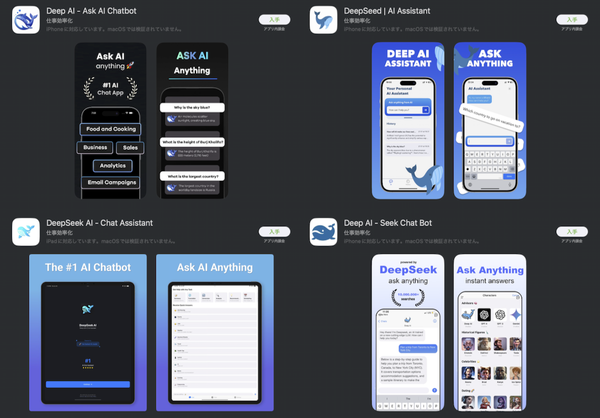 中国の推論型生成AI「DeepSeek」にそっくりなアプリが、アプリストアにて複数確認されている。