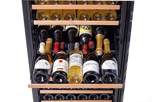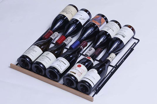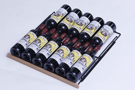 庫内のワインラックは、ブルゴーニュボトルやシャンパンボトルなどの径が太いボトルも安定して収納できるように設計。上の棚とワインが擦れてラベルが傷まないように、棚幅にもこだわりました。スムーズに引き出せるスライドラックで、ストレスなくワインの出し入れが可能です。