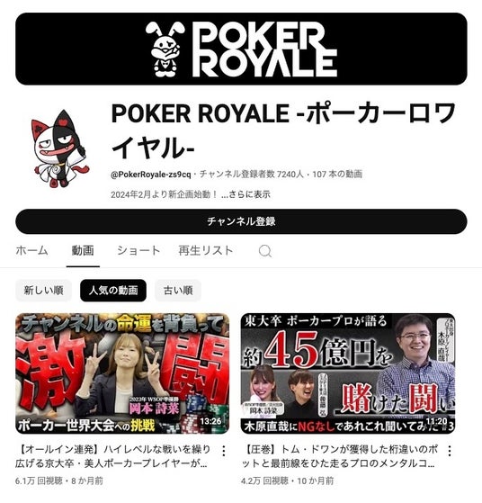 また、姉妹サービスとしてポーカーを中心とした動画配信を行うYoutubeチャンネル「POKER ROYALE」の運営も支援しております。こちらも是非ご視聴ください。