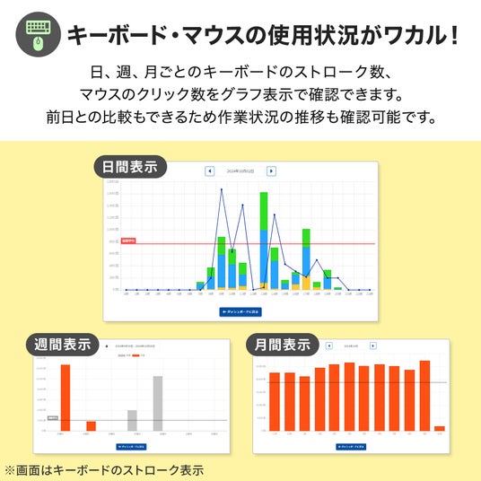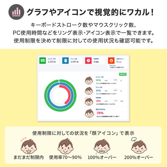 キーボードストローク数やマウスクリック数、パソコン使用時間などの使用状況をグラフやアイコンで直感的に確認できます。
