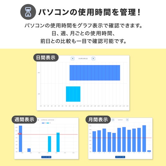 パソコンの使用時間を日、週、月単位でグラフ表示し、前日との比較も可能です。一目で使用時間の変化を確認できます。