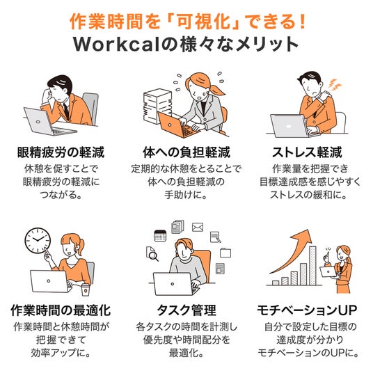 Workcalは、休憩を促して眼精疲労や体への負担軽減をサポートするとともに、作業量の把握による目標達成感でストレス緩和の手助けをします。また、作業時間と休憩時間が把握でき、効率アップにつながります。また、タスクごとの時間計測により優先度や時間配分を最適化でき、目標を可視化することでモチベーションアップにも繋がります。
