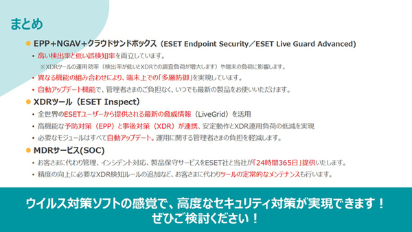 ESET PROTECT MDR Liteの特長として、多層防御型の予防製品であり、高い検知率と低い誤検知率を両立し、そして簡易な運用を実現している点が挙げられる。XDRツールは長年のノウハウを活かしたものであり、予防製品と連携することで高い検出能力を実現している。また、MDRサービスによって運用負担を大幅に軽減している(図26)。こうしたソリューションを検討・導入することで、ますます多様化・高度化するサイバー攻撃に対するセキュリティ強化を進めてほしい。