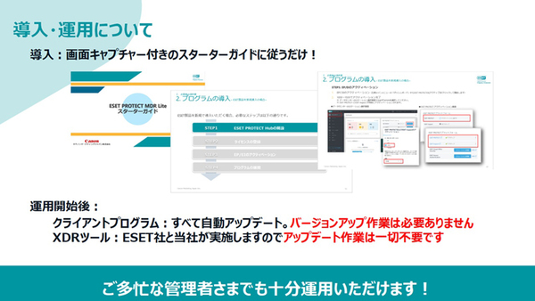 ESET PROTECT MDR Liteは導入と展開が容易に行えるという利点もある。画面キャプチャー付きのスターターガイドを提供しており、ガイドに従うだけでスムーズな導入が可能だ。必要なモジュールは、まとめて導入できるインストーラーを使用し、数クリックで簡単にインストールが完了する。クライアントプログラムは自動で更新されるため、ユーザー企業の管理者が対応する必要はない(図24)。