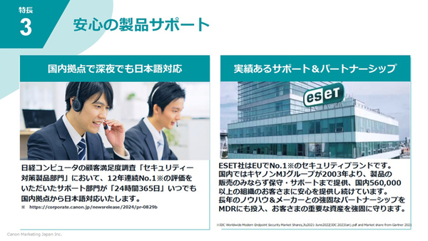 ESET PROTECT MDR Liteは製品サポートが充実している点も特長と言える。24時間365日のサポートが付属しており、ESETユーザー専用の窓口で日本語対応が可能だ。20年以上の実績を持つ総代理店として、ベンダーとの強い関係性と豊富なノウハウを活かし、ユーザー企業に安心を提供している(図23)。