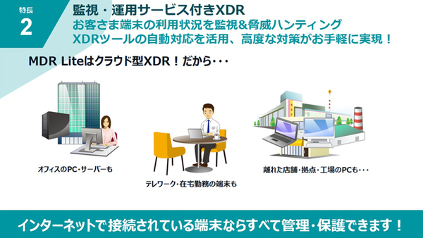 当社では、EDR/XDRの運用に課題を持つユーザー企業に対し、ソリューションとしてESET PROTECT MDRを提供している。EDR/XDRと、その運用サービスに加え、予防型セキュリティ製品を一括で提供するオールインワン型のエンドポイント対策ソリューションとなっている(図14)。