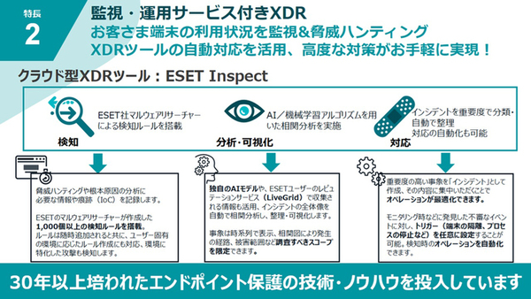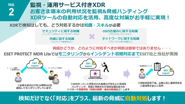 ESET PROTECT MDR Liteは、コストを抑えながらも基本的な機能には変更を加えず、バンドルされている製品ライセンスはESET PROTECT MDR Ultimateとまったく同じであるため、基本性能が劣ることはない。XDRの最も重要な機能である検知および対応、隔離に特化し、ESET社と当社のエンジニアが24時間体制で脅威を監視する。自動化機能を駆使し、リーズナブルに製品を提供できるよう設計されている。
