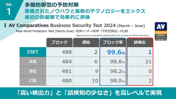 一方、ESET社の製品は予防型製品にパターンマッチングをあえて現在も採用している。マルウェアの大半が既知のものであるため、予防型製品の利用は今でも重要だ。以前から使われている技術ではあるものの、パターンマッチング方式は誤検知が少なく、端末への負荷が少ない点で優れている。