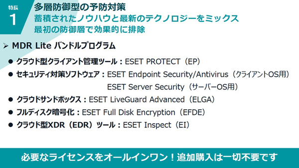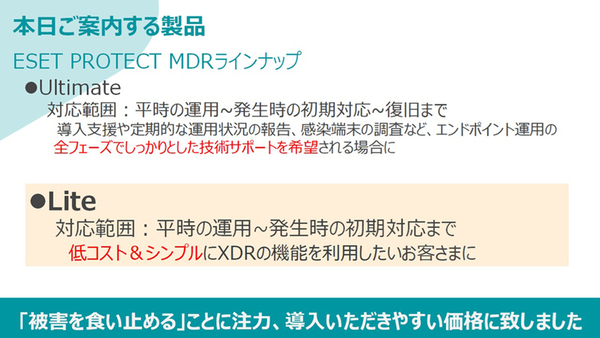 ESET PROTECT MDRは、主に2つのラインアップが提供されている。これまで取り扱っていた「ESET PROTECT MDR Ultimate」は、導入から運用、およびインシデント対応、復旧までをフルサポートするという利点があったが、その分費用を要するため、中小規模の企業で導入を躊躇する要因となっていた。 そこで、サイバー攻撃の被害を食い止めることに特化し、より費用を抑えた「ESET PROTECT MDR Lite」を紹介する(図15)。
