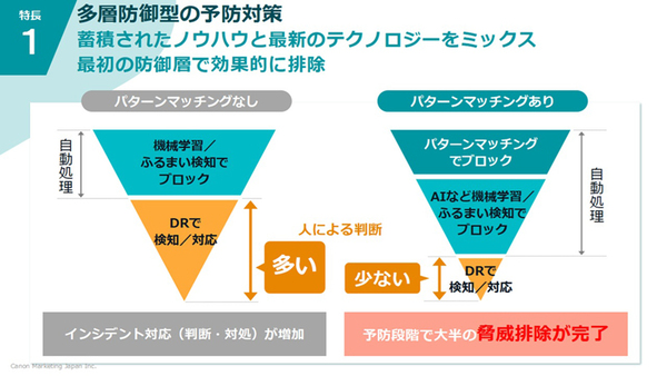 ただし、パターンマッチングだけでは未知の脅威に対処できない場合もあるため、AIや振る舞い検知エンジンを併用し、多層防御を実現している(図17)。また、クラウド上でサンドボックスを提供するなど、複合的にセキュリティを強化している。こうした予防型対策の充実により、XDR側の対応工数を大幅に削減している。