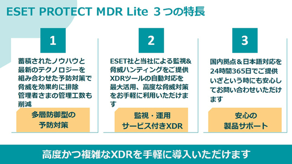 以降では、ESET PROTECT MDR Liteの基本的な特長を3つ挙げて説明する(図16)。