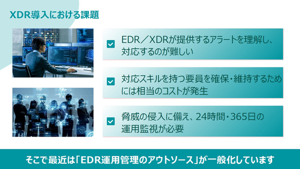 2つ目としては、EDR/XDRを運用するために必要なスキルを持つ要員を確保・維持するには、相当のコストを要するという課題が挙げられる。現在の人材市場を鑑みると、セキュリティ運用の専門家を抱えるためのコストは低くないのが実情だ。
