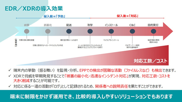 EDR/XDRを導入すれば、万が一侵入されてしまった場合でも、事後対策として従来のウイルス対策ソフトとは異なるロジックで脅威を検出し、分析や調査を行うことが可能だ(図10)。EDR/XDRは、その効果のわかりやすさから、経営層からの関心も高い。