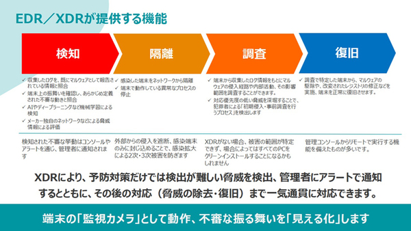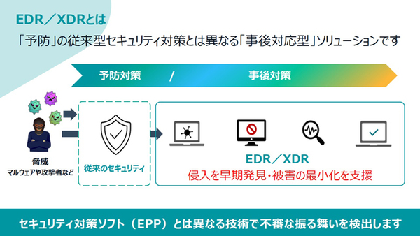 EDR/XDRは、コンピューターやサーバー上の脅威の検出から対応、復旧までを一元的に管理できるエンドポイントセキュリティソリューションである。既存のウイルス対策ソフトとは異なり、端末内のさまざまなログを収集し、サーバーで分析した上で管理者にアラートを通知できる事後対応型の製品だ。