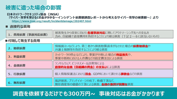 日本ネットワークセキュリティ協会(JNSA)の調査によると、サイバー攻撃の被害に遭った企業では、直接的な対応費用だけでなく、多様な損害が発生していることが明らかになっている(図9)。例えば、調査を依頼するだけでも数百万の費用を要する場合があり、その総額は相当な金額に上る。本調査によると、ランサムウェア被害に遭った企業・組織の平均被害額は2,386万円に達している。