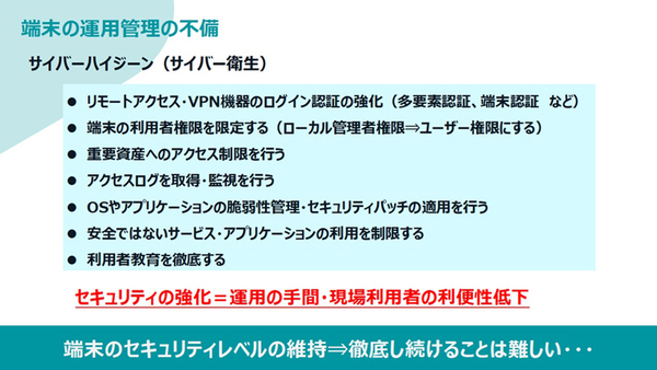 また、コロナ禍以降、急速に普及したテレワークも、サイバー攻撃の拡大に影響している。オフィスへの回帰が進む一方で、ハイブリッドワークを採用している企業も多い。そのため、リモートから社内システムを利用する際には端末のセキュリティが重要となる。コロナ禍に乗じて、社内外を問わず利用されるようになったコンピューターが攻撃者から標的とされているからだ。実際、リモートアクセス端末や機器の脆弱性が悪用され、被害に遭った企業は少なくない。