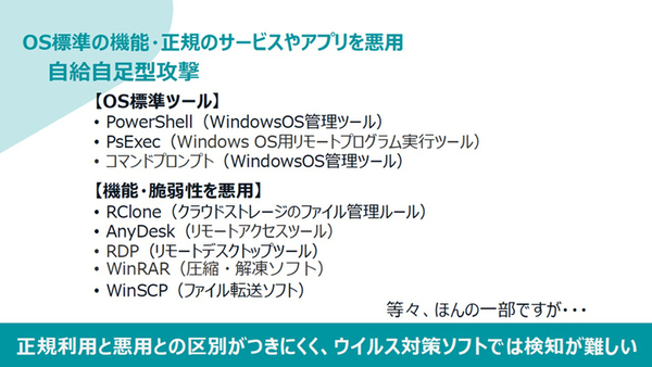 最近は、自給自足型攻撃とも呼ばれる、OSに標準搭載されているツールが悪用される攻撃も増えている。これらのツールは、端末の運用や業務に欠かせない便利なツールであるため、攻撃者に悪用されるリスクがあっても、利用を禁止するのは難しいものだ。さらに、正規の利用と悪用の区別がつきにくいため、ウイルス対策ソフトによる検知が困難である。同様に、代替手段が少ない商用ツールやフリーソフトウェアについても悪用されるリスクがある(図7)。