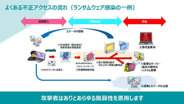 最近のサイバー攻撃であっても、決して未知の凶悪なウイルスによって突然発生するものではなく、さまざまな手口の組み合わせで実行されているという点に注意が必要だ。攻撃を完遂させるため、あらゆる脆弱性が悪用される(図6)。
