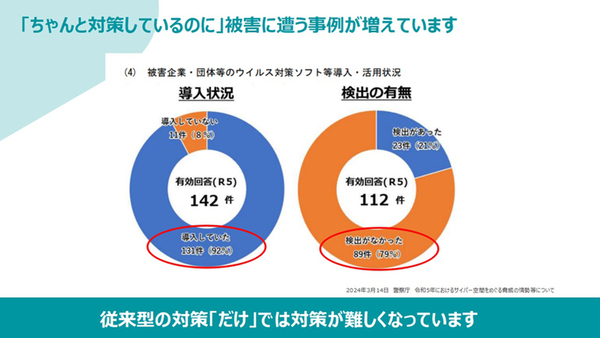 エンドポイントのセキュリティ対策としては、主にウイルス対策ソフトが利用されている。しかし、ほとんどの企業・組織に普及した現在でも、サイバー攻撃の被害に遭う事例が後を絶たない。先述した警察庁の資料によると、被害に遭った企業の多くがウイルス対策ソフトを導入していたにもかかわらず、検出や防御ができなかったという結果が報告されている(図5)。ここでは、従来のウイルス対策ソフトを導入しているにもかかわらず被害に遭ってしまう理由について触れる。