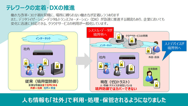 さらに、急速なテクノロジーの進化やデジタル技術の普及を背景に、多くの企業では競争力を維持・強化するために、デジタルトランスフォーメーション(DX)を推進している。これらの企業では、デジタル化による業務の効率化や競争力向上を目指し、事業環境の変化に応じて柔軟にシステムを変更できるクラウドアーキテクチャーの採用が一般的となっている。クラウドサービスの利用によって、企業のデータはネットワーク境界を越えて送受信されるため、自社内のシステムだけを保護する境界型防御では、データの漏えいや侵入のリスクを完全に防ぐことが難しくなっている(図4)。