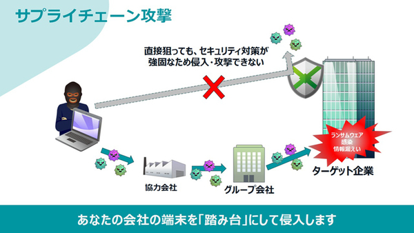近年、複数の企業が連携して価値を創出する「サプライチェーン」の重要性が増している。ビジネスを円滑に進めるため、異なる企業間で重要な業務情報がリアルタイムで共有されるようになってきた。そこで、サイバー犯罪者は、サプライチェーンに属する企業群の中から、セキュリティの甘いグループ会社や協力会社を標的にするのだ。仮に、狙った企業に重要な資産がなくても、よりセキュリティの強固な企業へ攻撃するための「踏み台」にする目論見もあるからだ。
