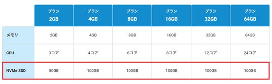 従来は4GB~64GBのプランにおいて、一律100GBの容量を提供していましたが、今回の強化によりディスク容量を最大2,400GBまで拡大しました。