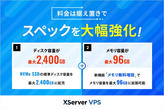 エックスサーバー株式会社(所在地:大阪市北区、代表取締役:小林 尚希)は、2025年2月3日、サーバー性能とコストパフォーマンスでNo.1(※1)を誇る『XServer VPS』の提供スペックを大幅に強化しました。今回の強化では、4GBプラン以上で一律100GBだったNVMe SSDのディスク容量を最大2,400GBまで拡大。さらに8GBプラン以上では、メモリ容量を無料で1.5倍に増設できる「メモリ無料増設」機能を新たに追加しました。