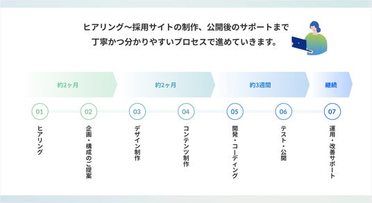 また、単なるサイト制作にとどまらず、企業ブランディングやコンテンツ提案、運用サポートといった付加価値をプラス。採用活動を成功に導く長期的な戦略を支える基盤を提供します。