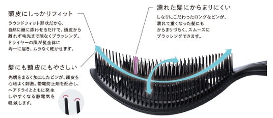 ラウンドフィット形状だから頭皮にしっかりフィット。ロングなピンが濡れた髪をかき分けて、ドライヤーの風を頭皮から毛先まで届けます。