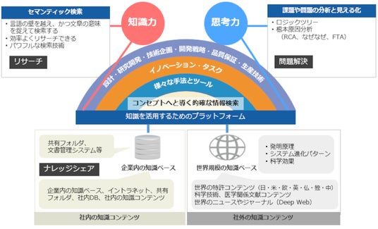 イノベーションに必要な情報を効率的に探索する「リサーチ」、問題をロジカルに構造化し解決コンセプトの作成を支援する「問題解決」、そして組織内にあるアイデアの再利用を促進する「ナレッジシェア」の3つの切り口から、製造業における組織や製品の企画・開発・運用それぞれの工程で抱える問題の解決案を発見し、それらを持続的な「イノベーション」につなげるためのソリューションです。