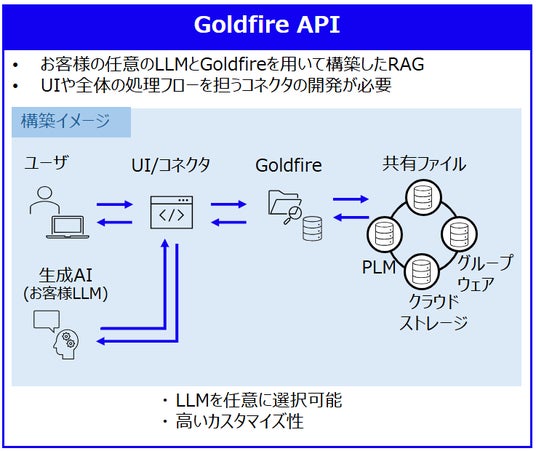 RAGシステム構築用に開発されたAPIです。Goldfireの検索結果をユーザー任意のLLM(Large Language Models:大規模言語モデル)に引き渡して回答を生成するため、カスタマイズしたRAGの構築が可能です。