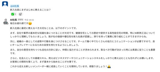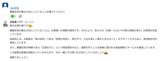 AI社長は、業務効率化やマニュアルの浸透を図り、皆さんの「冷静に目標を分析する力」を養いながら、健康住宅の価値観や理念を大切にする姿勢を応援してくれるはずです。